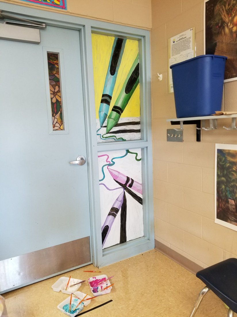 I have this window next to my door that I try and cover every year. This year I decided to use tempera paint and go to town on that window. I ended up choosing to paint crayons. This was the first time I painted on glass, and tempera paint was a pain in the you know what to paint on glass with.